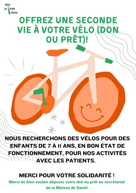 Merci de contacter le cabinet au 05.49.74.21.04 si vous disposez d’un vélo en bon état, taille 20 à 24 pouces, afin de soutenir nos activités thérapeutiques avec les patients