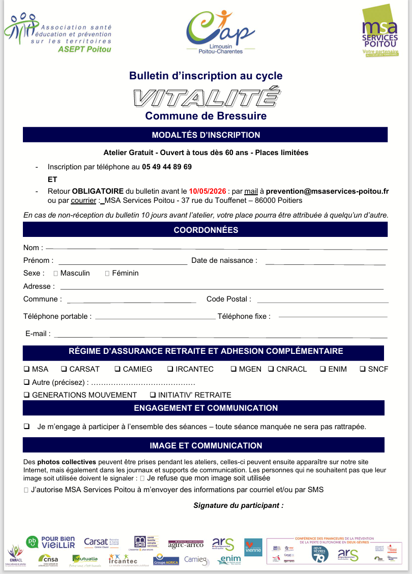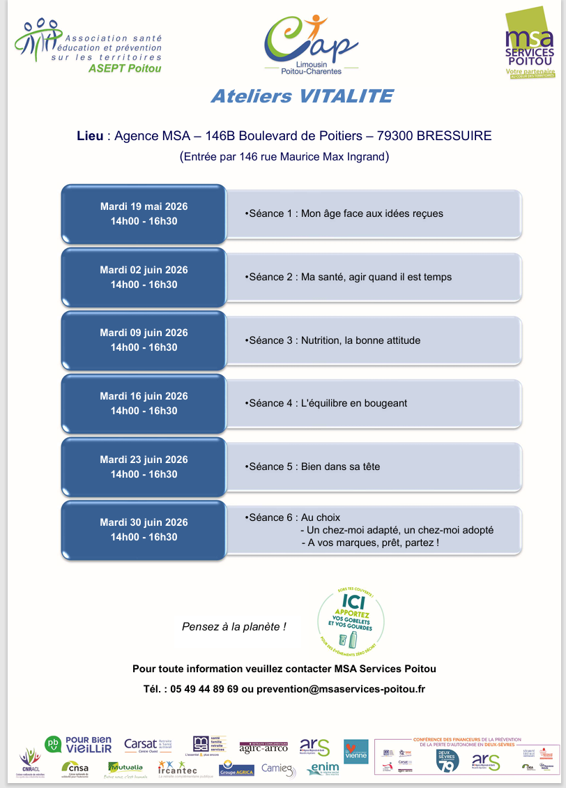 Pour aborder différentes notions de prévention santé sur le « bien vieillir » et adopter les bons réflexes, nous vous proposons de participer à un cycle d’atelier pluri thématiques, mis en œuvre par l’ensemble des caisses de retraite en coordination avec l’ASEPT POITOU et la MSA Services Poitou :